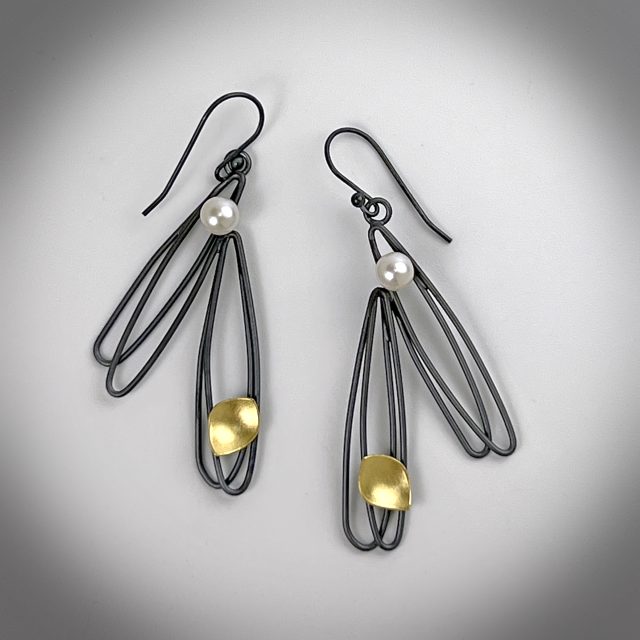 Oxidized sterling silver, 23 k gold leaf, pearls