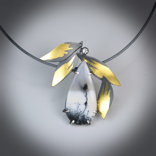 Oxidized sterling silver and 23k gold leaf petals surround this very unique prong-set agate. A 3mm faceted white sapphire sits atop the pendant, creating a star-like accent to this one-of-a-kind statement necklace. Lobster clasp closure.