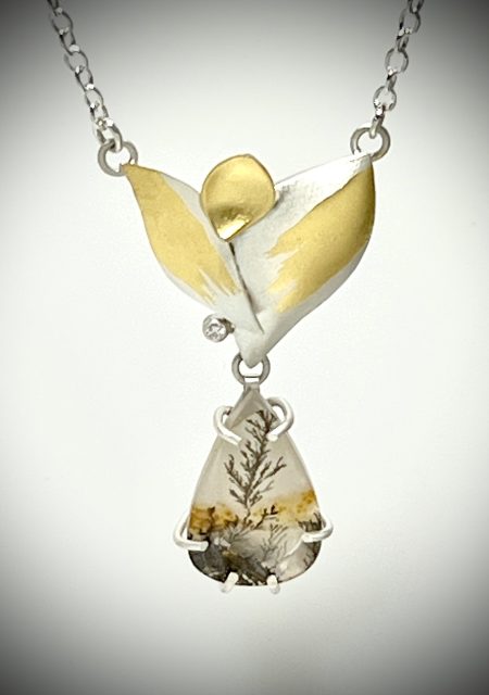 A one-of-a-kind pendant featuring hollow-formed, gracefully curved petals of sterling silver, richly accented with 23k gold leaf. A dangling dendritic quartz reveals a natural, desert plant–like landscape within the stone. A subtle 2 mm lab-grown diamond adds a refined sparkle.