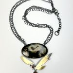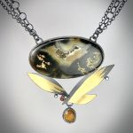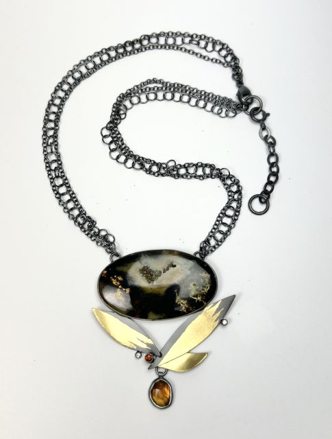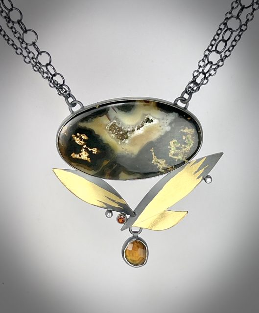 Oxidized sterling silver, 23 k gold leaf, IndonesianMoss Agate, lab grown diamonds, citines
