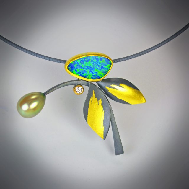A luminous opal doublet set in 22k gold is paired with a 3 mm diamond in 14k gold and a soft pearl. Oxidized sterling silver and accents of 23k gold leaf create rich contrast and warmth.