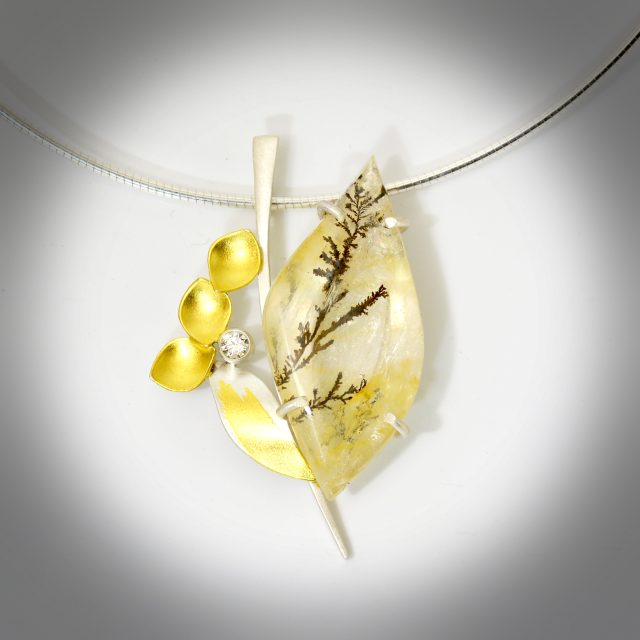 This one-of-a-kind necklace pairs sterling silver with 23-carat gold leaf, showcasing a captivating dendritic quartz gemstone whose natural patterns evoke delicate ferns. A brilliant lab-grown diamond adds a modern touch, blending earthy elegance with contemporary luxury.