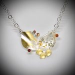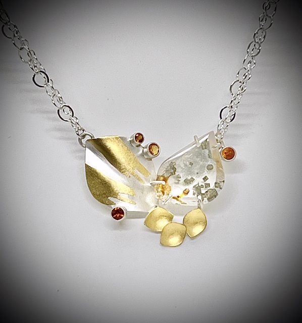 A luminous necklace crafted in sterling silver and accented with rich 23k gold leaf. Marcasite-in-quartz gemstone adds subtle sparkle and depth, while faceted citrines bring warm, golden light. Elegant and refined, itβs a striking balance of earthy texture and radiant brilliance.