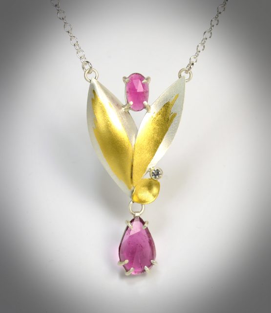 Sterling silver, 23 k gold leaf, rose cut pink tourmalines, 3 mm white sapphire